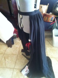 I measured and drew the desired shape on butcher paper (another old DnD map) and traced one on the black and one on the yellow fabrics. I then carefully cut them out and pinned them together, starting with the point of each bat wing shape to be sure they lined up correctly. I then stitched them together and turned it inside out to hide the edges, just like a simple cape design. Originally, I had planned to add interfacing to give the wings some stiffness and shape, but I really liked how the material flowed without it. Then I simply closed up the top of the "wings" and hand stitched it into the waistband of the skirt, underneath the already finished bustle.