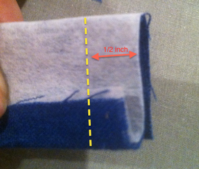 Step 3: Cut a strip of your prewashed fabric about 4 inches wide and about 10 inches longer than your leg measurement. Once you cut this strip, fold and iron it in half length-wise with the WRONG side of the fabric out. Then sew the open length closed so that you end up with a tube with the correct side of the print on the inside. Once that's done, pull the tube so that the correct side of the fabric is on the outside.